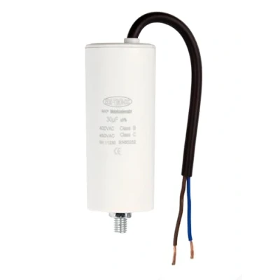 motor capacitor Capacity: 30uF / Tolerance: ±5% Operating voltage: 450 V Dimensions: diameter 45 x 97 mm Cable connection: 14 cm, attachment: M8