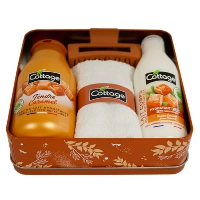 Naturally derived formula A gourmet offer with caramel Dermatologically tested Box contents: 1 soft caramel moisturising shower lotion 250 ml + 1 soft caramel moisturising body lotion 200 ml + 1 cotton towel + 1 hair clip Our shower gels are produced and assembled in France