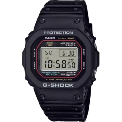 Materials: plastic strap in black with pin buckle, resin case in black, mineral glass, anthracite dial Design features: digital display, case diameter 5 mm, black case and strap, glow in the dark elements Functionality: stopwatch, countdown timer, alarm, lighting, quartz movement with battery operation, digital time display for precise readability Technical data: quartz movement, 200 m water resistance, silver oxide (Ag₂O) battery included, model number DW-5000R-1AER More information: Suitable for men, battery included, G-Shock series, model number DW-5000R-1AER