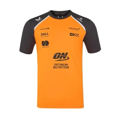 AUTHENTIC DESIGN: Official McLaren F1 Team merchandise featuring the 2025 season livery colours in vibrant orange with grey sleeves and team sponsor logos PERFORMANCE MATERIAL: Technical fabric construction designed for comfort and durability during race day or casual wear SPONSOR DETAILS: Features prominent team partnerships displayed on the chest and shoulders TEAM BRANDING: McLaren Racing logo and signature design elements reflect the team's professional motorsport heritage STYLE FEATURES: Athletic fit with crew neck design and contrast colour blocking between the orange body and grey sleeves