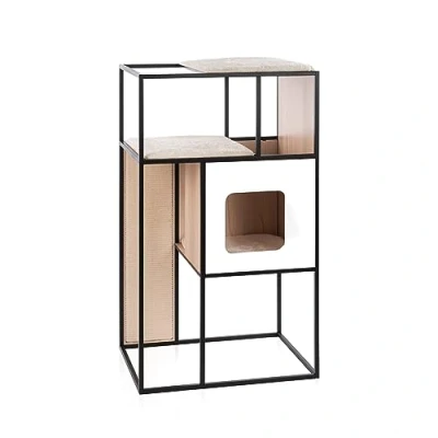 Elegant linear cat tree with 3 levels Cosy cat den lined with wood laminate panels Natural sisal scratching mat Easy to clean