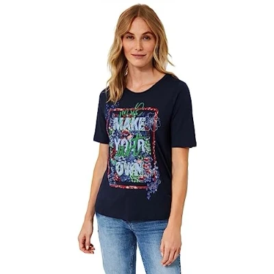 Cecil short-sleeved shirt with crew neck, side ruffles, decorative stitching on the back and colourful front print The women's shirt has a flame yarn look and goes with jeans, shorts and cargo trousers The Cecil brand has a casual/sporty orientation, new customers recommend ordering one size smaller