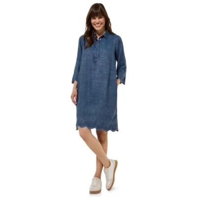 Knee-length denim dress Shirt collar with decorative button placket 3/4 sleeves Broderie on hem and sleeves Soft lyocell quality