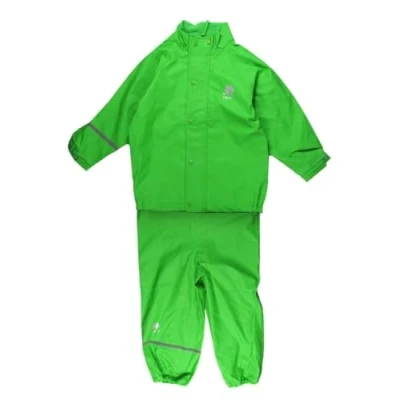 100% waterproof and windproof green unisex children's rain suit including jacket and dungarees made of robust material and taped seams, for outdoor activities on rainy days, forest walks and school walks Heat and tear protection thanks to lightweight and elastic material, jacket with zip at the front under press stud strip for optimal water protection, removable hood and collar with fleece lining, elastic sleeves, waistband with Velcro fastener Comfortable fit thanks to dungarees with elastic braces, side press studs to adjust the fit, wear over boots thanks to elastic cuffs and adjustable boot strap, name tag in jacket and trousers. Size: 100, can be worn over trousers and sweaters, dry the rainwear after use; do not spin, do not tumble dry or use fabric softener Box contents: 1 x Celavi children's unisex rain suit, waterproof, 5000 mm hydrostatic head, jacket and dungarees with braces, size: 100, colour: green, 1145