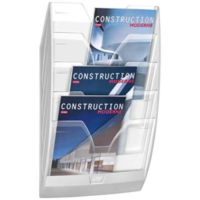 Magnetic wall display rack fitted with 5 transparent compartments to allow great visibility of contents, perfect to sort or showcase documents such as leaflets, brochure, … Fitted with 2 powerful magnets, it can hold up to 7 kg of documents Accepts A4 and 24 x 32 cm size documents Wide entry to enable easy access to contents 100% recyclable, high quality PS plastic - Dimensions: 35 x 12, 8 x 58 cm
