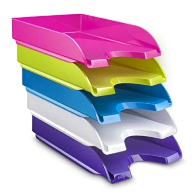 Set of 5 assorted colours for quick and efficient filing With its contemporary design, this basket will fit into any office style. It accepts documents up to 24 x 32 cm and elastic pockets. The practical opening at the front allows you to easily capture the contents of your documents. These baskets are stacked vertically or "stairs". Compatible with the 220+ bin for customised storage of files. 450 sheets capacity: Dimensions: Useful 335 x 245 H 55 mm. Dimensions: Overall 348 x 257 x 66 mm. The practical opening at the front allows you to easily capture the contents of your documents. These baskets are stacked vertically or "stairs". 450 sheets capacity Dimensions: Useful 335 x 245 H 55 mm. Dimensions: Overall 348 x 257 x 66 mm. 1 purple, 1 white, 1 ocean blue, 1 anise, 1 pepsy pink.