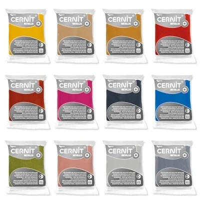 Cernit Metallic is a polymer clay in metallic colours. This kit contains 12 assorted 56g pieces in 12 colours: 045 champagne, 050 gold, 051 green gold, 052 rose gold, 057 copper, 058 bronze, 080 silver, 085 pearl, 200 blue, 460 magenta, 700 yellow and 900 Purple . Create your jewellery, figurines, decorative objects, etc. by giving them a metallic look with Cernit Metallic pasta. Cernit pasta should be well kneaded before modelling. Combine colours with each other or with colours from other Cernit ranges to create effects., Manufacturer: CERNIT