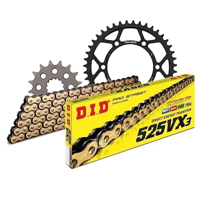 Perfectly coordinated MXT chain set made from high-quality individual parts from the premium brands D.I.D and Supersprox. The original gear ratio of the bike is retained. Chain: DID X-Ring 525VX3 / 108 Rivet Lock ZJ Gold/Black (5/8 x 5/16 x 10.16) - [ Chain Wheel ] Supersprox 525 LK 130.0 mm Diameter 110 mm 43Z 6-Hole Steel Black - [ Sprocket ] Supersprox 5 25 16Z D.I.D is a manufacturer of drive chains and other products for the motorcycle and automotive industry. In addition to drive chains, the company also sells sprockets, chain kits and other drive elements that play an important role in improving the performance and safety of vehicles. Heavy duty chain, durable sprocket and reliable sprocket for a smooth ride Fits Yamaha MT-07 2014 - 2022, Yamaha XSR 700 A 2017 - 2022, Yamaha YZF-R7 700 2022