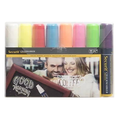 Easy to remove with damp, soapy cloth Writes on all non-porous surfaces and takes minutes to dry Writes on all non-porous surfaces (chalkboards, glass, mirrors, plastic, metal) Just shake, press and write The writing and images are protected against smudging and splashing water (on Securit chalkboards)