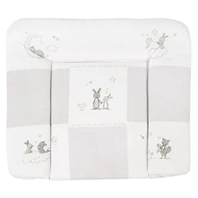On this soft changing mat in a playful Fox & Bunny design, your child is comfortable when changing and caring for The surface fabric is skin-friendly and cuddly for your baby. Changing pad made of cotton polyester blend and phthalate-free PU coating. The changing mat is softly padded for comfortable and comfortable lying when changing and grooming. Dimensions: 85 x 75 cm, height approx. 4 cm, are adapted to most "standard changing tables". The surface of the changing mat is wipeable and easy to clean. All materials used are tested for harmful substances and certified. In addition, regular checks are carried out during production. They are 100% PVC and phthalate free. The changing pad is available in many different colours, e.g. In the roba designs Little Stars, Maya Bee, Lucky Angel, etc. Care instructions: do not dry clean