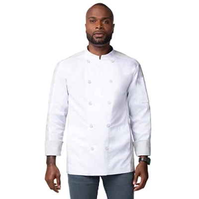 Double breasted button front with side slits Two front hip pockets, left sleeve thermometer pocket with three divides Long sleeves Color-coordinating Stretch Cool Vent Mesh Back Collar Apron Tab