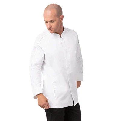 Cool vent underarm and sleeve panels, stretch knit sleeve and side panels Single breasted with hidden snap closure Sleeve seam piping detailing Back collar apron holder with engraved snap tab Modern fit: Mf1