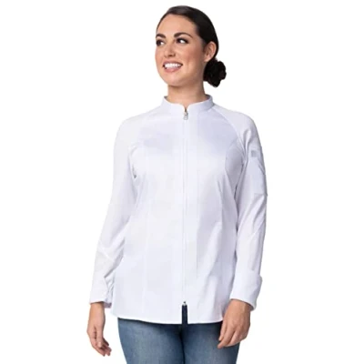 Comfortable fit and minimalistic design Soft-touch knitted, Cool Vent mesh fabric on the sleeves and back yoke Raglan long sleeve Single breasted with front center zipper Thermometer pocket and hanging loop