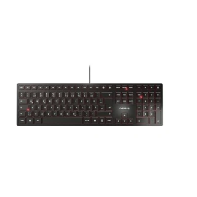 Wired design keyboard: particularly flat housing for fatigue-free work - easy connection via plug & play without additional software (USB-A connection) For style-conscious users: Puristic trendy design with red backlit keys* makes the cable keyboard an eye-catcher on any desk (* Keyboard is not backlit Faster typing and creating more: CHERRY SX scissor technology ensures a precise pressure point and an optimal writing experience. Perfect for frequent writers 3 status LEDs (CAPS LOCK, NUM and SCROLL button) and 6 handy additional buttons: Windows Lock, Open Browser, Quieter, Louder, Mute and Calculator open with just one touch Robust and high quality: integrated metal plate, non-slip rubber feet, more than 10 million key operations without loss of input quality, as well as durable key labeling