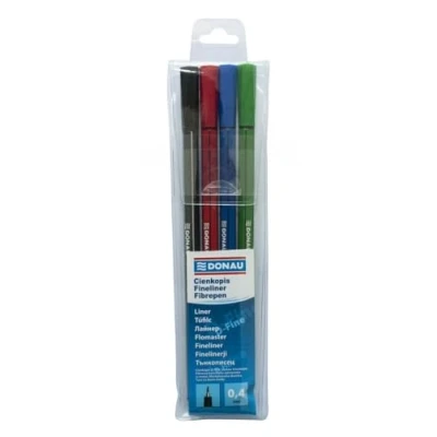 DONAU 7362904PL-99 D-FINE FINELINER 0.4mm - 4 PACK/4 PIECES Colour: various colours – in 4 colours (black, red, blue, green) fibre tip in metal / metal-clad tip for a long service life Water-based ink, resistant to drying Odourless. Non-toxic. Line width: 0.4 mm. Suitable for rulers and templates Case in the colour of the ink, with a hexagonal shape and stripes along the housing, in the case colours Vented cap in ink color with hexagonal tip Line length: 500-600m. Writing line: 0.4 mm. Tip: 0.4 mm On each fineliner the model designation D-fine, the Danube brand and the thickness 0.4 mm Ideal for creating colourful notes, working with a template etc. For use in the office, school and home