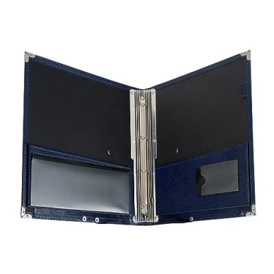 Luxury music folder, 335 x 280 mm, filling height from about 2 cm, blue imitation leather Four metal protective corners, stop-band adjustable hand strap Hinged ring element for sheet protectors (sleeves are not included) Large inside pockets, transparent pocket for credit cards Weight: 532 g