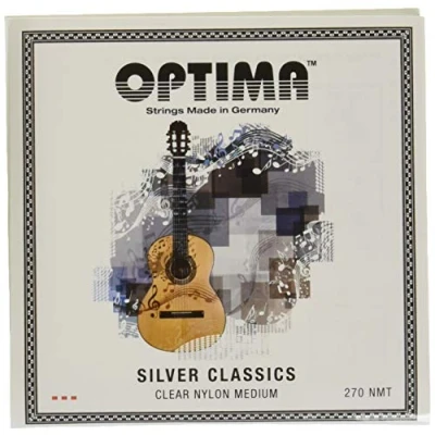 Package dimensions (L x W x H): 11.5 cm, 11.9 cm, 1.6 cm The best materials for the highest demands. Package weight: 37 g Set / Classical Guitar Trebles: Clear NylonBasses: Silver-plated woundMedium TensionOPTIMA SILVER CLASSICS - Optima's new concept of the development of the No.6 series has also been the basis for the further development of this popular string series. An extremely good string which is suitablefor any guitarist. Due to its coating the string also has ahigh durability. Best materials for the highest demands The wound is coated to make the string more durable