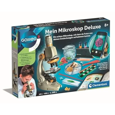With 3 lenses: the microscope has three lenses with 100x, 400x and 1200x magnification. Detailed illustrated instructions make handling the microscope easy and understandable Box contents: 1 x Galileo Lab My Microscope Deluxe by Clementoni – also ideal as a gift for Christmas, Easter or birthday to inspire children playfully for science With practical smartphone holder: thanks to the universal smartphone holder, your child can document their discoveries with their mobile phone and share the impressive photos with friends For young scientists: in addition to the children's microscope, the research kit includes extensive laboratory accessories such as slides, Petri dish, measuring cup, pipettes, test tubes (made of plastic) and a test tube stand