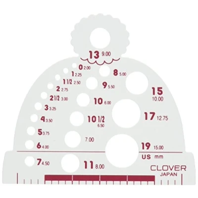 Measures 20 needle sizes. (Sizes 2mm to 15mm) Handy ruler on the base. Perfect for everyone who holds on to their knitting needles forever! This gauge will help you to determine the gauge of your needle long after the manufacturers printing has warn off Manufactured in Japan, Manufacturer: Clover
