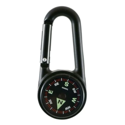 A carabineer with a built-in compass Very easy to attach to a pair of trousers, a belt or bag The compass is filled with liquid for accuracy