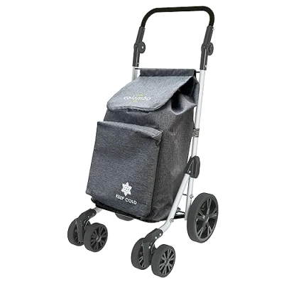 Aluminium Shopping Trolley Spacious polyester bag with 44 litre capacity, front thermal pocket and back pocket Adjustable handlebar with non-slip rubber grip Push and pull: you can both push and pull the trolley thanks to the 6-wheel system Dimensions when opened: 102 x 55 x 46 cm (HxWxL) - Dimensions when folded: 90 x 17 x 44 cm (HxDxL) - Weight: 3.8 kg
