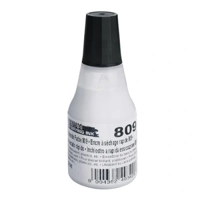Extremely long durability in the impregnated stamp, especially for printers with cover and EOS stamps. The standard cushion insert from our self-inking stamps can be used. It is not necessary to use a felt cushion Can be used with all types of rubber, both natural rubber and synthetic materials is not problematic. Good adhesion of colour on poly bags Polymer text boards are not suitable for use with 809 stamp colour