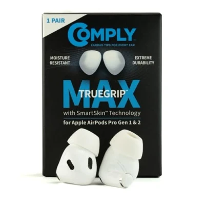Comply TrueGrip MAX Premium Memory Foam Replacement Earbud Tips for Apple AirPods Pro 1 & 2 Long Lasting Comfort, Extreme Durability, Secure Fit, Superior Noise Isolation White (Medium) (1 Pair)