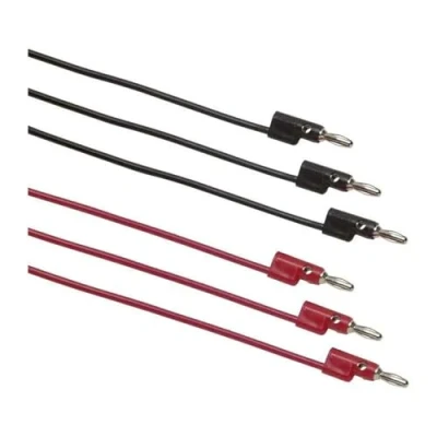 3 sets (red and black pairs) of 4mm stackable banana multi plug patch cords Nickel-plated banana plugs 60cm, 90cm and 120cm long PVC insulated cords 30V RMS or 60V DC, 8A