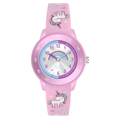 High-quality children's watch from Cool Time in unicorn design and Japanese quality movement Plastic housing diameter 30 mm; case back, crown and clasp made of stainless steel; water resistance tested up to 5 bar/ATM Comfortable, durable silicone strap with unicorn print; length 75 x 105 mm Child-friendly, easy-to-read dial, thanks to clear numbers and minute divisions