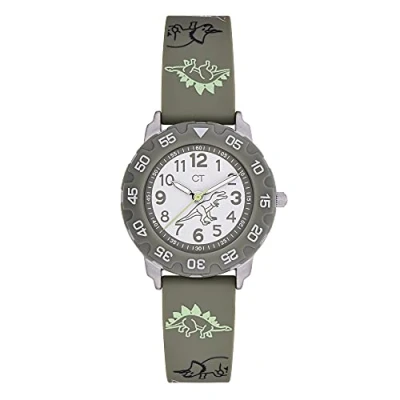 High-quality children's watch from Cool Time with rotating top ring and dinosaur motif Metal housing with rotating top ring in IP silver diameter 30 mm; case back, crown and clasp made of stainless steel; scratch-resistant mineral glass, water resistance tested up to 3 bar/ATM Japanese quality movement, comfortable, durable silicone strap in green with dinosaur motif, 65 x 100 mm Child-friendly, easy-to-read dial, thanks to clear numbers and minute divisions Includes cool owl pencil case as packaging