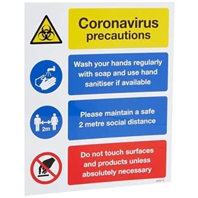 Safety sign to help display and advise of steps to take to mininmise the impact of coronavirus. Use as part of your workplace control measures during the COVID19 outbreak High quality print on glossy white, rigid PVC Waterproof - suitable for indoor and outdoor locations Lightweight with high impact strength, easily drilled for fixing Self-extinguishing material prevents the ignition of flames & flame spread