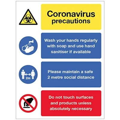 Coronavirus precautions sign Wash hands, maintain 2 metre distance, avoid touching surfaces