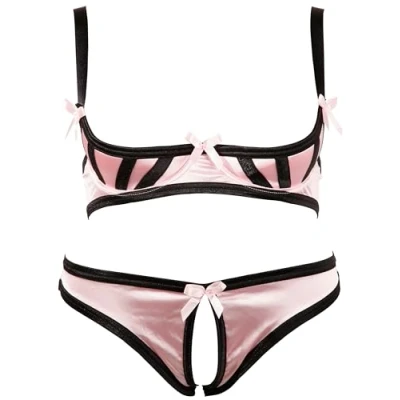 Set of pink satin with black details Made of 88 percent polyamide and 12 percent elastane material Underwired bra with slightly padded cups and adjustable straps Makes you unique, sexy and very attractive Fantastic fit and very comfortable to wear