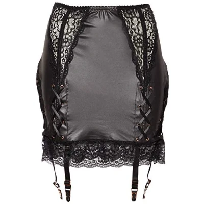 A beautiful matt black skirt with lace panels With 6 adjustable and removable suspenders Material: 90% polyester, 10% elastane