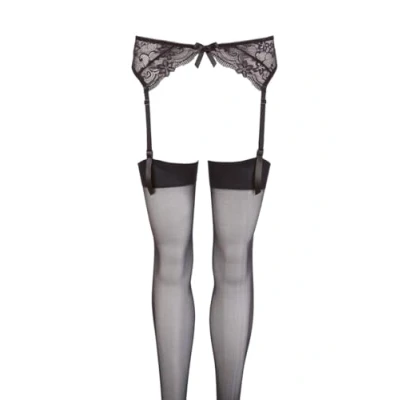 Lace suspender belt with variable suspenders Simple black stockings included Advised with excitement beside himself Black lace suspender belt with adjustable suspenders Plain stockings complete this seduction outfit