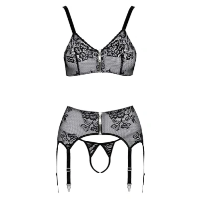 Soft bra, suspender belt & crotchless thong in a set White fronts with lace coating Bra and suspender belt with zip 6 adjustable suspenders Adjustable straps