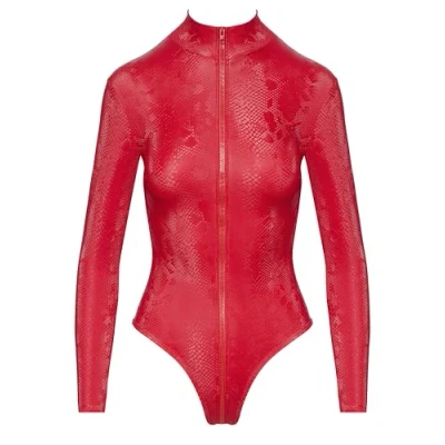 Long sleeve body with a stand-up collar Trendy snakeskin look 3-way zip that goes right to the top of the buttocks Soft & stretchy for a comfortable fit