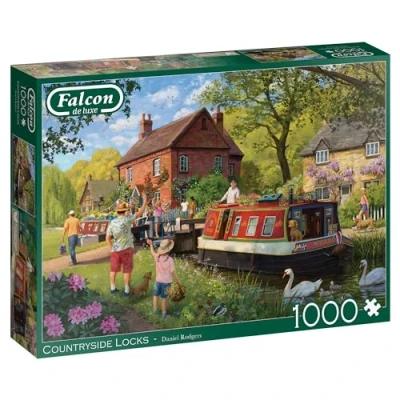 Tranquil 1000-piece jigsaw puzzle, perfect for a serene escape into the countryside. Illustrated by Daniel Rodgers, showcasing the beauty of Countryside Locks on a Summer's Day. Part of Falcon's Scenery puzzle theme, capturing a picturesque scene with boats navigating locks. Finished puzzle measures 68 x 49cm, creating a poster-like display of the peaceful Summer scene. Crafted with precision using premium recycled board, ensuring each piece maintains its original shape., Manufacturer: Galt