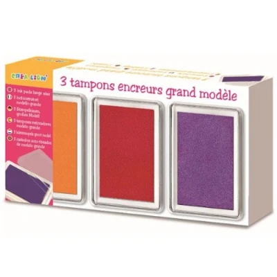 Product description: large model ink box for arts and crafts. Ink pads 6 x 9.5 cm. Contains 3 orange, red and purple inkers. Minimum age : 3 years, Manufacturer: Créa Lign'