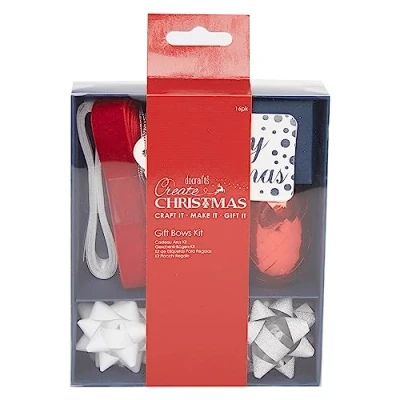 CRAFT There is nothing better than the build up to the most wonderful time of the year. Combine with a cellophane wrap to create the ultimate Christmas hamper basket, or attach to a gift bag or personal present for a sentimental touch. CONTENTS Pack includes 16 pieces of gift tags, a variety of bows, assorted ribbons, and curling ribbons, the essential set of supplies for gift wrapping. Perfect for creating a hamper, festive basket, gift bag and many more! PERSONALISE No wrapped gift is complete without a tag for your personal message, decorate gifts with the festive assortment of ribbons and bows.Make your own handmade card and show off your gift wrapping with this Christmas Set! EMBELLISH Enhance your gift wrapping skills with our Create Christmas Red & Silver Gift Bow Kit. This all-inclusive kit is perfect for DIY enthusiasts, suitable for Christmas, Birthdays, Wedding, a Baby Shower and many more occasions BRAND The Create Christmas brand was designed with the festive season in mind. It is a best-selling range of everything you could need for seasonal crafting. Offer fantastic value and amazing quality for your gift wrapping and craft requirements