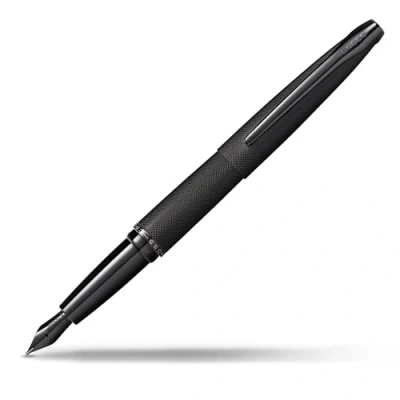 Complete design by Cross. This fountain pen impresses with its textured diamond look with polished black hardware The ATX family fountain pens feature a chic, urban design and makes them the ideal gift for any occasion This elegant fountain pen features a handmade, precision-ground stainless steel nib, coated with polished black PVD of line width M = medium. The tapered silhouette ensures a comfortable writing experience The elegant writing instrument contains two black Cross standard ink cartridges #8921. Specially formulated ink flows flawlessly and dries quickly. Also refillable with converter Box contents: Cross ATX fountain pen in brushed black, nib size M = medium, 2 black ink cartridges (#8921), in premium gift packaging