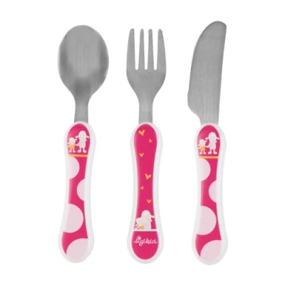 Three-piece cutlery set consisting of knife, spoon and fork - suitable for all parts of the Schnuggi tableware series Sustainable, robust and durable – made of stainless steel, plastic handles made of ABS, of course free from plasticisers, tested safety by accredited testing institutes according to current (European) law Child-friendly, rounded shape - wide, comfortable handle - encourages independent eating Gift series "Schnuggi": cup, plate and bowl available in matching sheep design Box contents: 1 Sigikid cutlery set Sheep Schnuggi Classic; age: 24 - 96 months; highest quality and safety in material and workmanship: tested several times, sustainable and durable; dishwasher-safe; item number: 25421