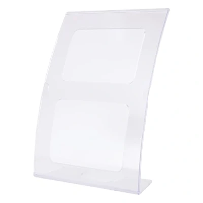 Functional table stand with convex shape for displaying flyers in A4 format. Can be placed on a desk or a counter Perfect for presenting information brochures at receptions, service points and during training and presentations. Dimensions: 148 x 210 mm