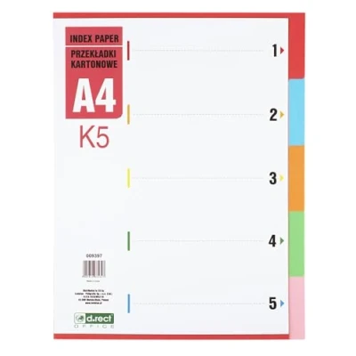 Folder dividers with coloured tabs for dividing and organising A4 documents. Different coloured index tabs allow you to quickly find the documents grouped in groups Cover sheet to indicate and describe the contents. Notebook edge with universal perforation for use in ring binders of all kinds. 5 dividers: 1-5