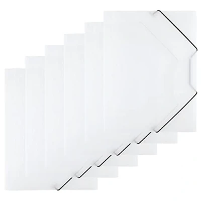 Tri-fold folder for storing and transporting A4 documents The elastic bands for secure corner tension and the three flaps on the under lid ensure a secure storage and prevent the documents from falling out Made from strong opaque PP with a thickness of 450 microns Colour: transparent Wide application - especially when the office stays at home.
