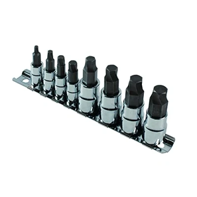 4 x 1/4" drive socket bits: 3, 4, 5, 6 mm. Length:37mm 4 x 3/8" drive socket bits: 7, 8, 9, 10 mm. Length:48mm Chrome vanadium steel socket, S2 steel bits. Special profile to securely grip the damaged hex bolt. Supplied on a metal support bar for convenient storage. Extractor set for damaged Torx screws also available - see Laser Part No. 8053