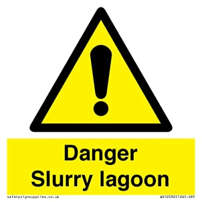W001 : General Warning This sign is made from plastic semi-rigid 1mm 1mm thin plastic sign, can be screwed, stuck with adhesive, or attached with cable ties. Not suitable for hanging. S85 square Sign Text: Danger Slurry lagoon