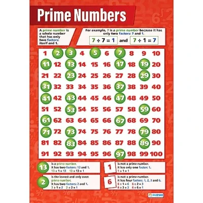 Educational poster (possibly DESIGNED BY TEACHERS Our Prime Numbers poster helps students to learn, engage and remember more information than ever before. Covering the basics of prime numbers, this unique school poster can play a vital role in improving both students' understanding and classroom décor. Knowledge Expansion Our educational school posters are colorful, beautifully illustrated, and contain a huge amount of valuable information. The Math poster is specifically designed to help students gain a greater understanding of prime numbers. The wall poster is a great resource for Schools, Classrooms, Maths Teachers, Students, School Members, Home Parents and School Kids. MAKE LEARNING FUN: Engaging, clear and colorful designs and images create a fun learning environment in which students can unfold. Our great wall posters can help to promote school children's interest in maths while repeating any important information they've learned. LARGE SIZE - GREAT FOR READING FROM A DISTANCE Our school wall charts are a generous size of 594 x 850mm (A1). So all posters are easy to read even from a distance. Our educational posters offer an excellent way to visually enliven and enhance any classroom as they are suitable for any type of learning environment. Manufactured by Daydream Education, the UK's leading provider of educational posters for schools, with an assortment of over 25 topics across key grades 1-5. By combining a bold, visual approach with simple, concise information, we have provided over five million resources for more than 50,000 classrooms worldwide.