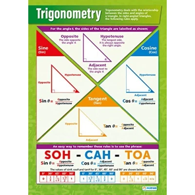 Educational poster (possibly DESIGNED BY TEACHERS Our Trigonometry poster helps students to learn, engage and remember more information than ever before. Covering the basics of trigonometry, this unique school poster can help students learn and make the classroom more engaging. Knowledge Expansion Our educational school posters are colorful, beautifully illustrated, and contain a huge amount of valuable information. The Maths poster is specifically designed to help students gain a greater understanding of the trigonometry topic. The wall poster is a great resource for Schools, Classrooms, Maths Teachers, Students, School Members, Home Parents and School Kids. MAKE LEARNING FUN: Engaging, clear and colorful designs and images create a fun learning environment in which students can unfold. Our great wall posters can help to promote school children's interest in maths while repeating any important information they've learned. LARGE SIZE - GREAT FOR READING FROM A DISTANCE Our school wall charts are a generous size of 594 x 850mm (A1). So all posters are easy to read even from a distance. Our educational posters offer an excellent way to visually enliven and enhance any classroom as they are suitable for any type of learning environment. Manufactured by Daydream Education, the UK's leading provider of educational posters for schools, with an assortment of over 25 topics across key grades 1-5. By combining a bold, visual approach with simple, concise information, we have provided over five million resources for more than 50,000 classrooms worldwide.