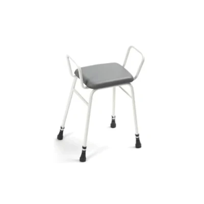 Height adjustable perching stool with arms is an ideal bathing chair for those who have limited mobility, elderly, disabled, or handicapped Stool is lowered at the front to give a slight incline for easier transfer when raising and lowering from the stool Made from powder coated steel with a grey vinyl seat provides a strong, durable, and safe bath chair Equipped with non-marking slip-resistant rubber tips that provide safety and security when in use Seat height can be adjusted (at front) from 540 to 700 mm (21-1/4 to 27-1/2) and has a maximum user weight of 190kg (30 st)